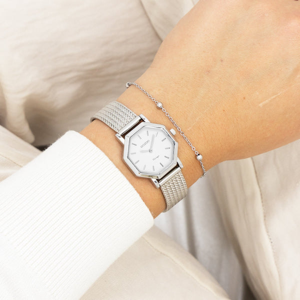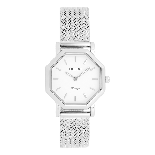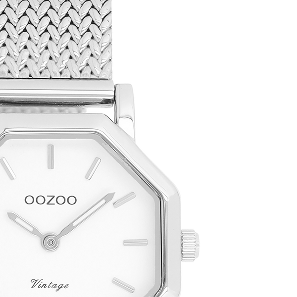The classic look stays key in this trendy series and therefore, this octagon OOZOO vintage design with a playful wink is the season must-have! This ladies watch is the perfect combination of fashion and comfort with its 28x28 mm silver coloured metal watch case and white dial. The silver coloured metal v-mesh bracelet makes this watch a trendy accessory, which you can wear every day. The dial has silver coloured stripes digits and matching hands. The C20435 adds the sparkle to your outfit. The mineral glass lays in a mm slim metal watch case with IP-plating. This design has a stainless steel backplate and is nickel safe. This watch has a 2ATM Japanese movement and is covered by a 2 year warranty